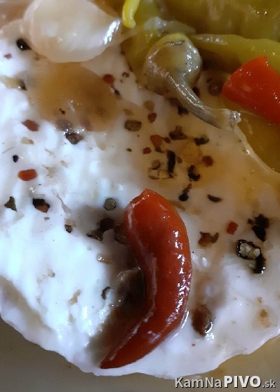... odležaný, dobre prezretý biely syr s plesňou, prerezaný, naplnený plátkami cesnaku a nahrubo mletým korením štyroch farieb, servírovaná s feferónom a baraními rohmi. Klasický. Chlieb postarší, suchší kazil dojem z konzumácie. Za encián 4/5.