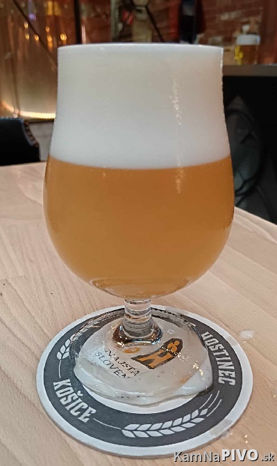 ... hladšia aróma po zrelom citrusovom, tropickom a bobuľovom ovocí, jemne pikantná, alkohol ukrytý, tekutina výraznejšie zahmlená svetlejšej oranžovej farby, pena bielej farby, hustá, tvorená drobnými bublinkami, s dobrou retenciou, zanechala krúžky, v chuti po zrelom tropickom , mierne po hrozne, obilnine, cereálna, jemne po po keksíku, alkohol ukrytý, horkosť mierna po kôre citrusov, telo stredne plné, mierne lepkavé, sýtenie stredné, alkohol ukrytý, pitelnosť viac ako dobrá (8, 3, 3, 16.5, 3, 3, 7) 43.5 - 87 - 8.7/10