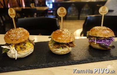 Jednou z ostatných možností bolo aj ochutnať trio burgeríkov s trhaným kačacím mäsom (a naservírované na doske, nie zabalené vo fólii a konzumácii niekde v parku, či ...). Vlastne išlo o jeden základ, žemľa, mäso a doplnené troma rozdielnými ingredieciami, (5/5).