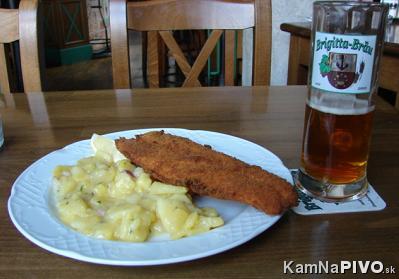 Reštaurácia ponúka rakúsku kuchyňu, resp. viedenskú. Denné menu majú za 7,50€, alebo za 6,90€, ja som si vybral to lacnejšie, iné už pred treťou nebolo, nuž nestálo za veľa (teda to jedlo), cesnaková polievka s opečenými krutónmi, v trojobale neidentifikovateľná ryba a zemiakový šalát bez majonézy s väčším množstvom cibuľe s octom. Nuž, aspoň som od rána niečo, okrem piva hodil zo žalúdka. Ale neprišiel som tu jesť, dávam si druhé Helles.